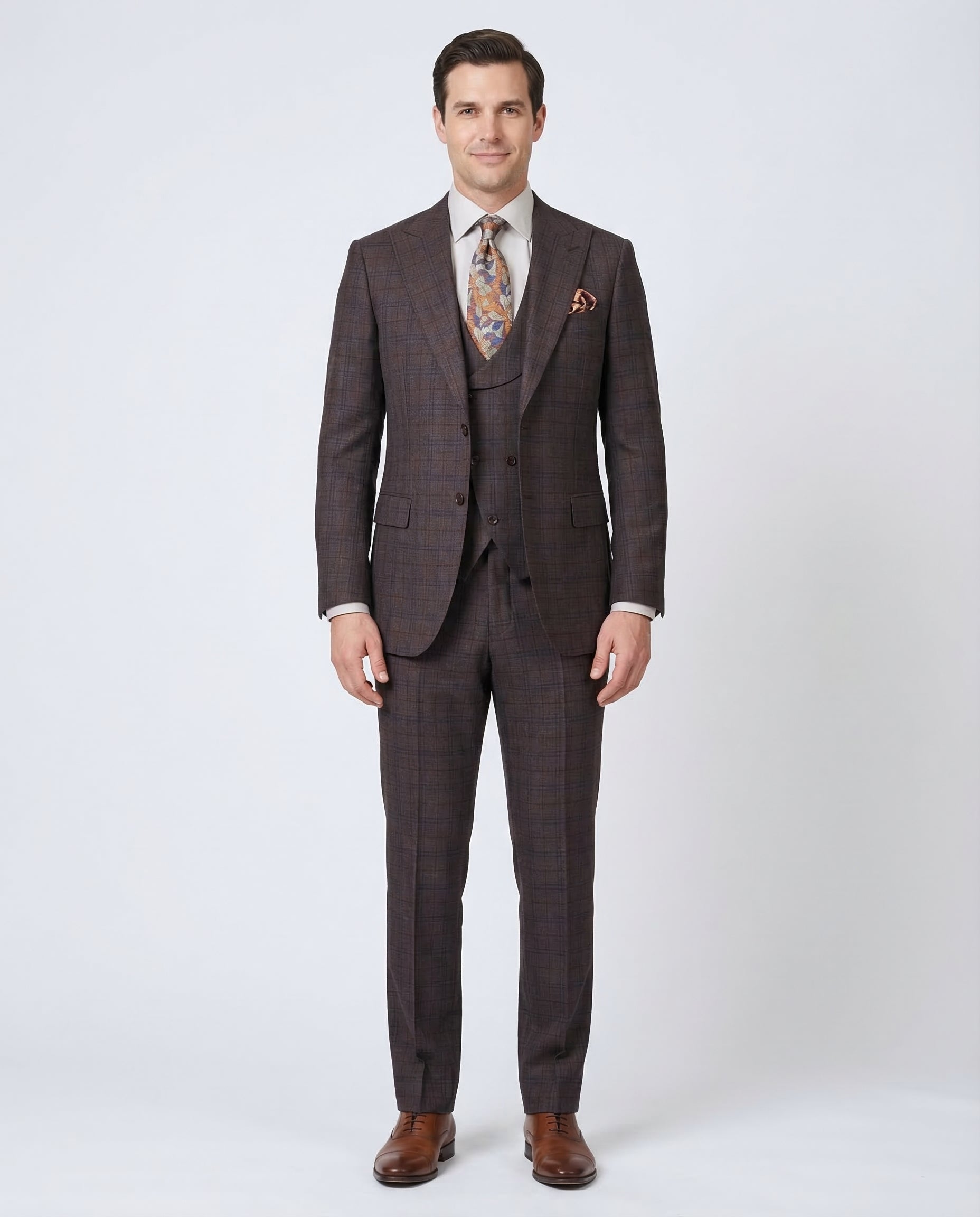 Apollo King Mens Brown Plaid Regular Fit 100% Wool 3 Piece Suit With Peak Lapels