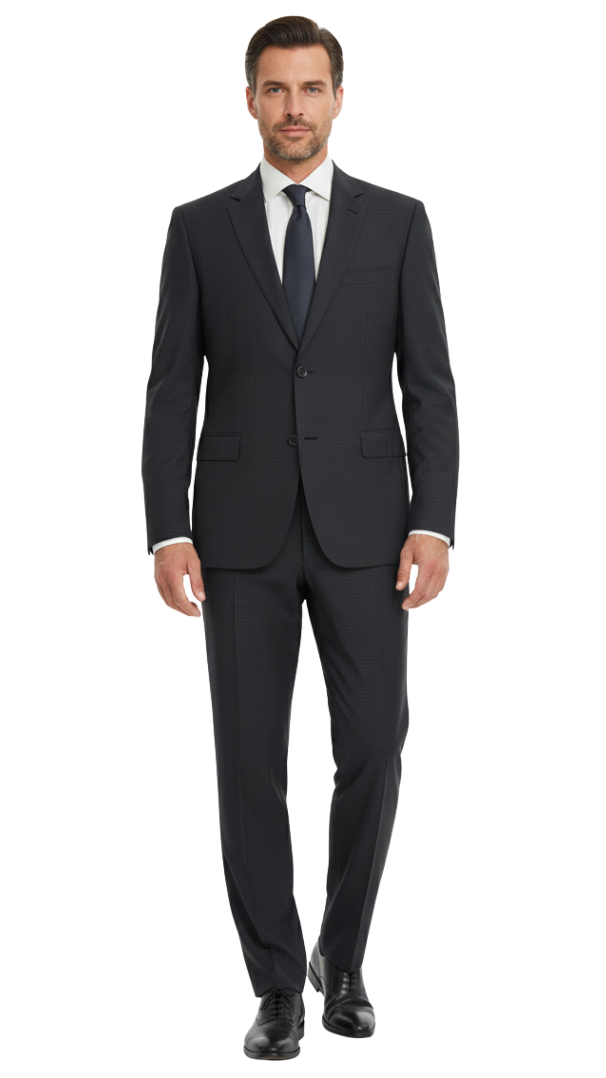 • Includes plain front trousers and a two-button jacket.
