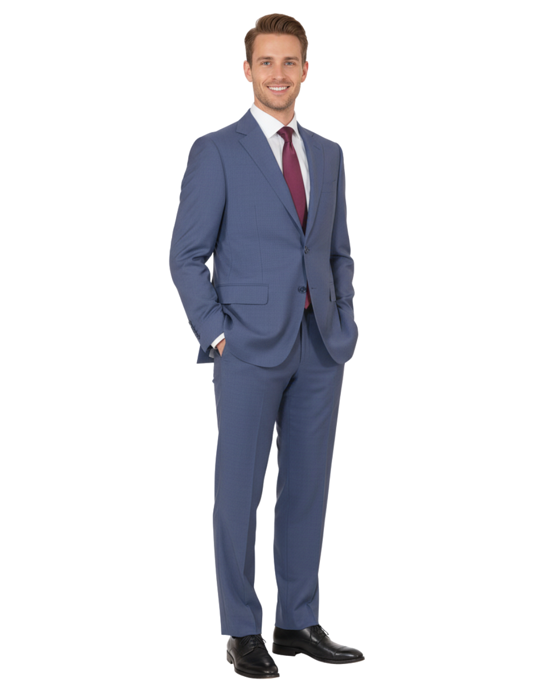 • Includes plain front trousers and a two-button jacket