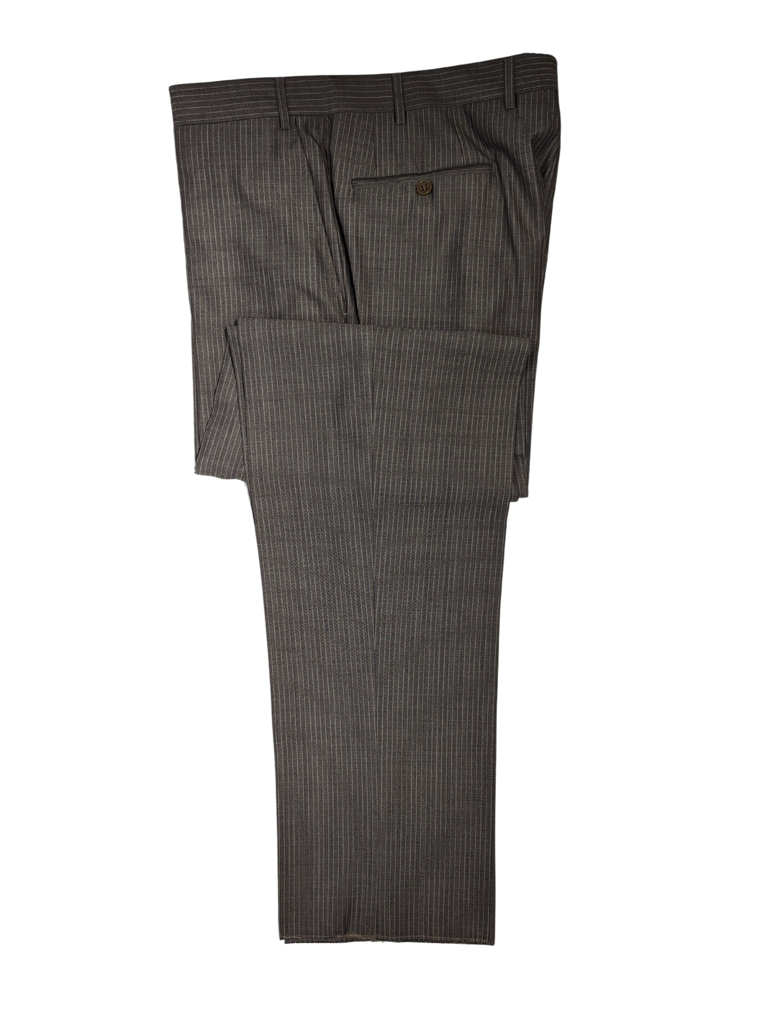 This Canali suit features a bold white pinstripe on gray fabric, crafted in Italy from a luxurious blend of 60% wool and 40% silk. The fully canvassed, fully lined two-button jacket is designed with dual side vents and a traditional silhouette. Matching flat-front trousers come unhemmed for easy tailoring. A timeless choice for business or formal occasions.
