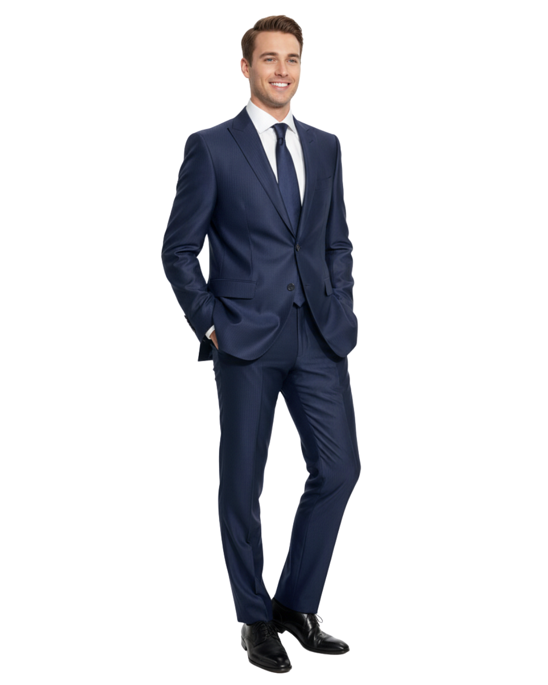 This Canali navy blue subtle pinstriped suit is crafted from 60% wool and 40% silk in a slim fit. It features a peak lapel, two-button front, and side vents for comfort and mobility. The subtle pinstriped pattern adds depth without overpowering, making it ideal for both business and formal wear. Finished with flap pockets and flat-front trousers, this suit reflects timeless Italian tailoring.