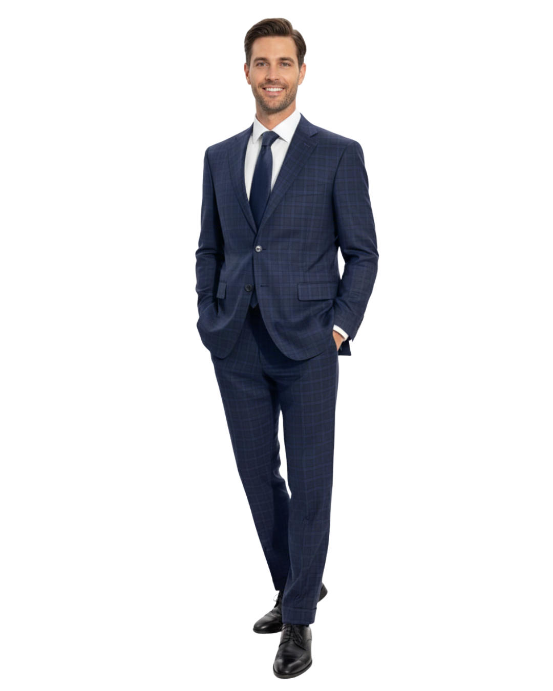 This Canali navy blue windowpane plaid suit is crafted from 100% wool. It features a notch lapel, two-button front, and side vents for comfort and mobility. The windowpane plaid pattern adds depth without overpowering, making it ideal for both business and formal wear. This suit reflects timeless Italian tailoring.