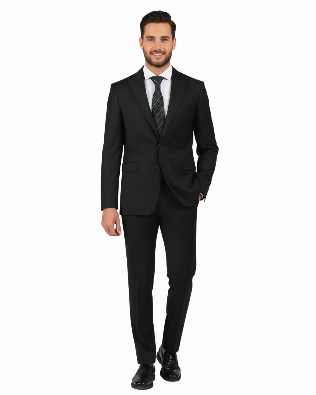 A finely made peak lapel suit at a reasonable price? You found it. This Slim Fit Black Peak Lapel Suit is made from wool blend fabric that drapes superbly across the body. The slim fit is modern and sharp. It’s the perfect suit for wedding parties and groomsmen, as well as for year-round business wear.