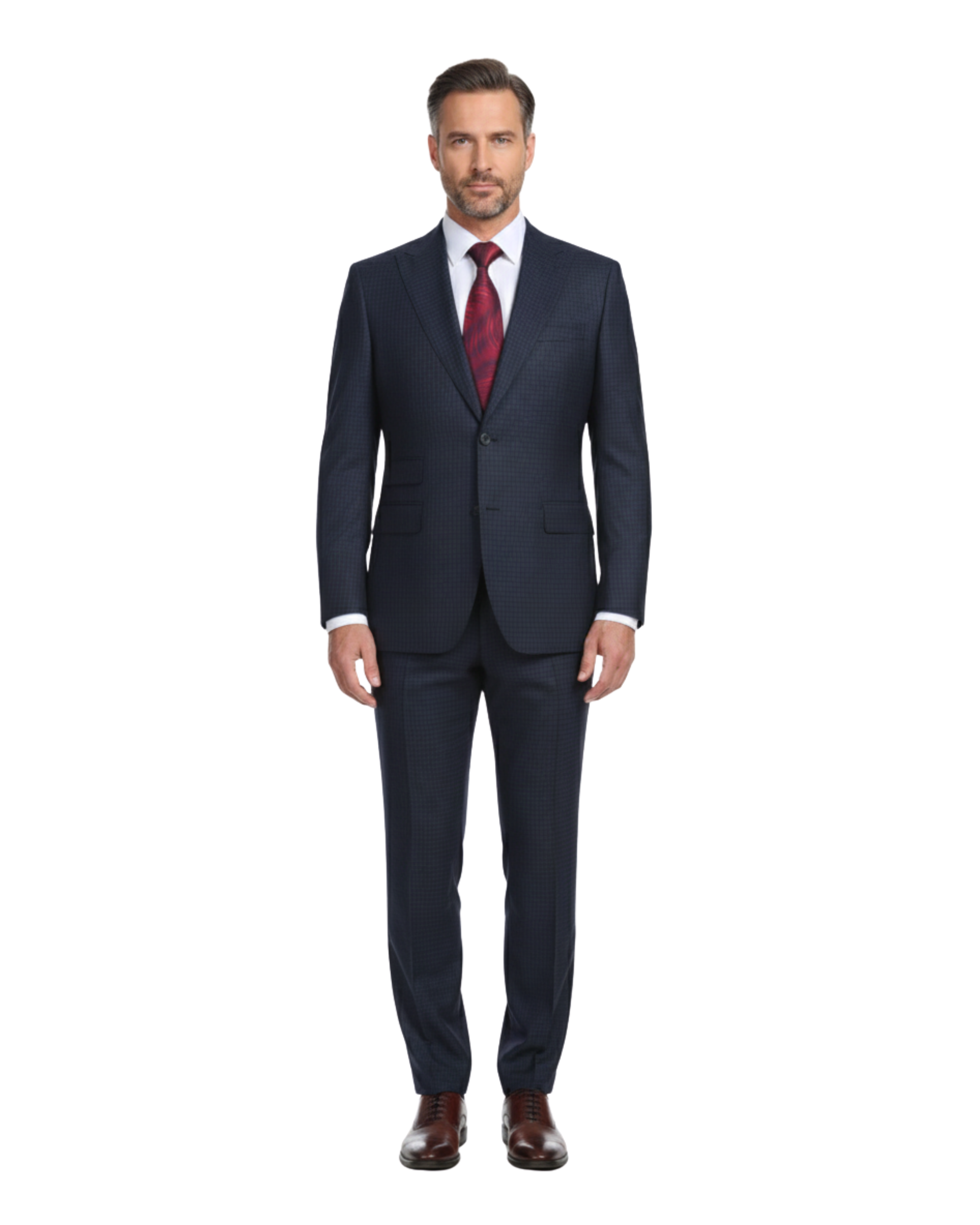 Looking for a finely tailored peak lapel suit at an unbeatable price? You've found it. This navy and black check... Read more