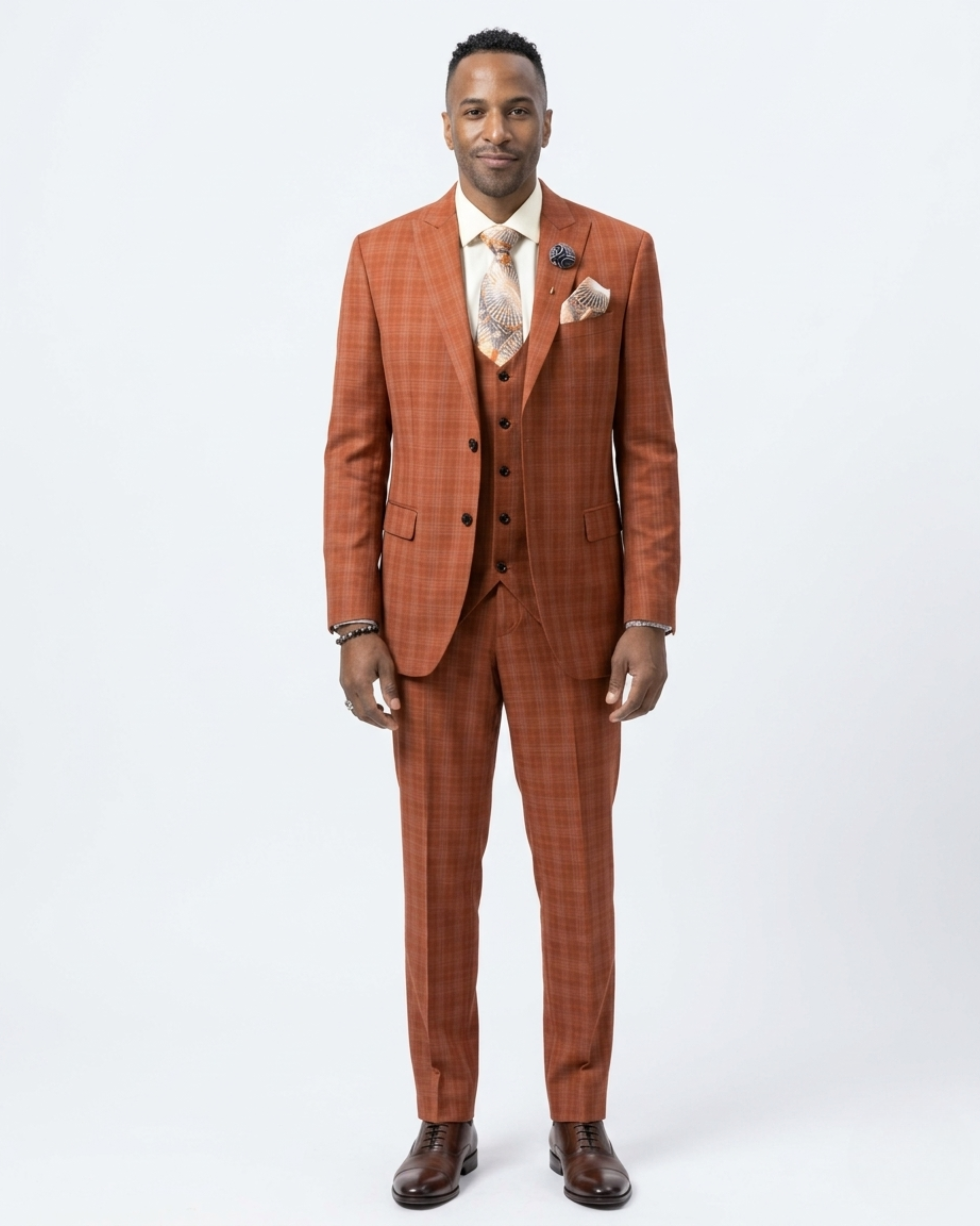 Kent & Park Mens Rust Orange Plaid Classic Fit 3 Piece Suit With Peak Lapels
