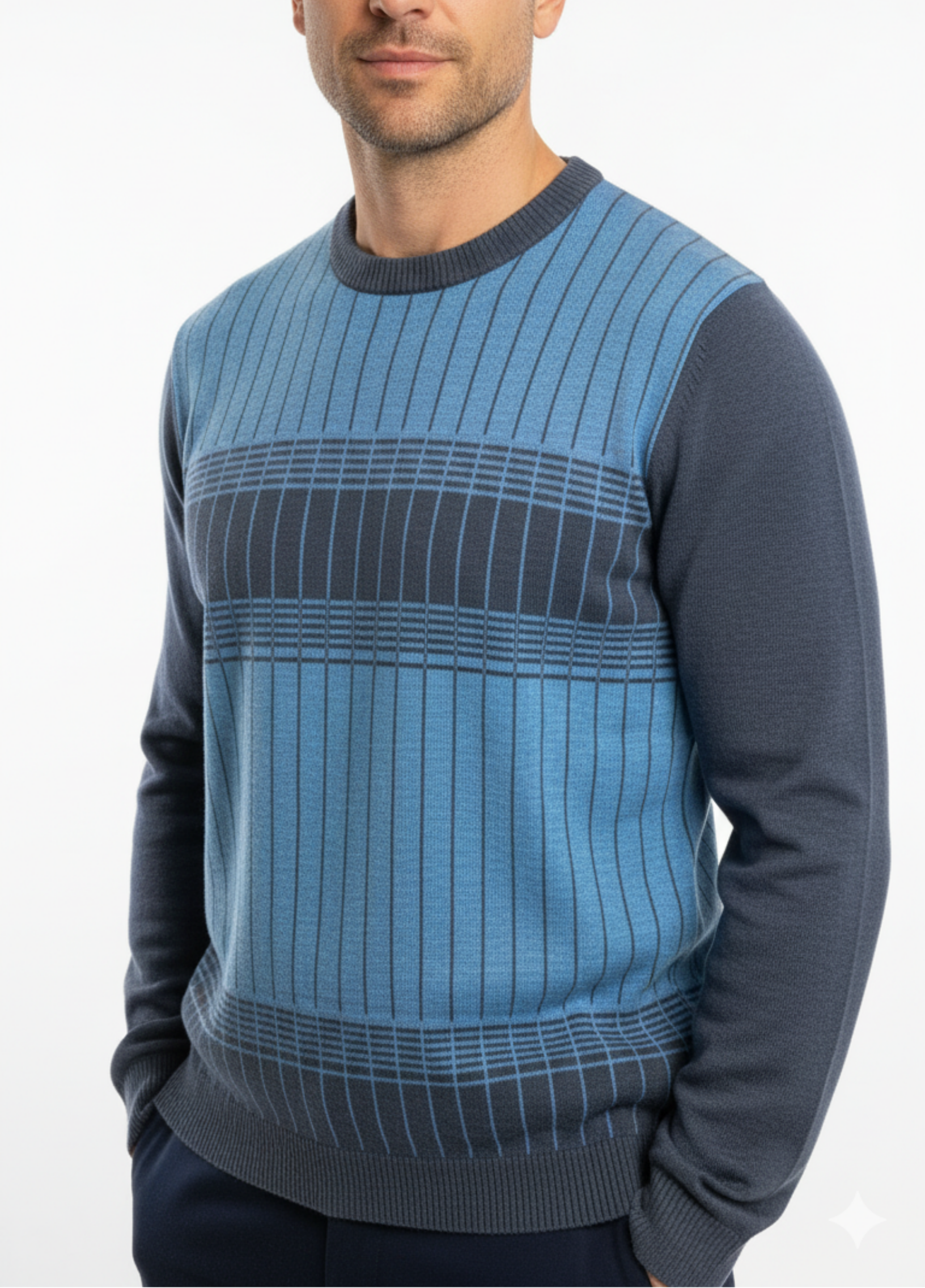 This Lavane crewneck sweater showcases a bold sky blue and navy colorblock design with vertical and horizontal stripe detailing across... Read more