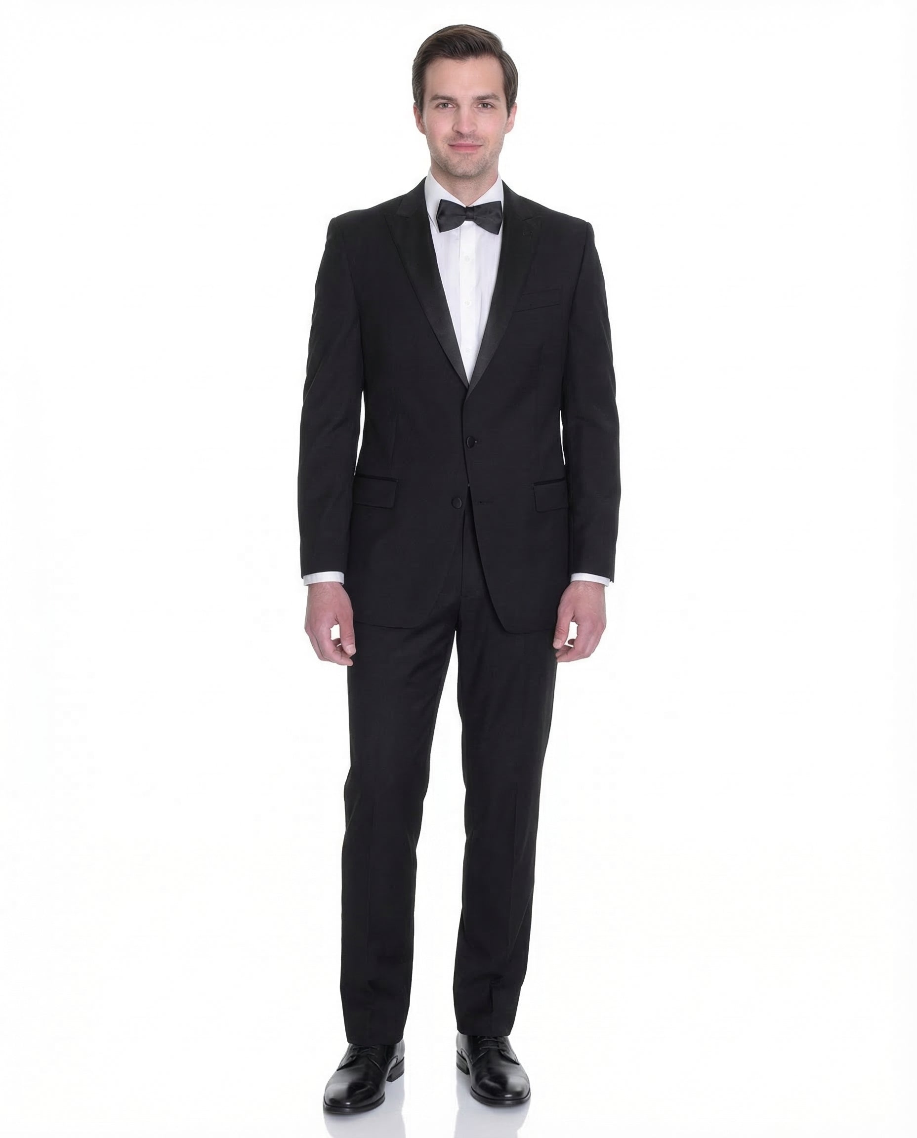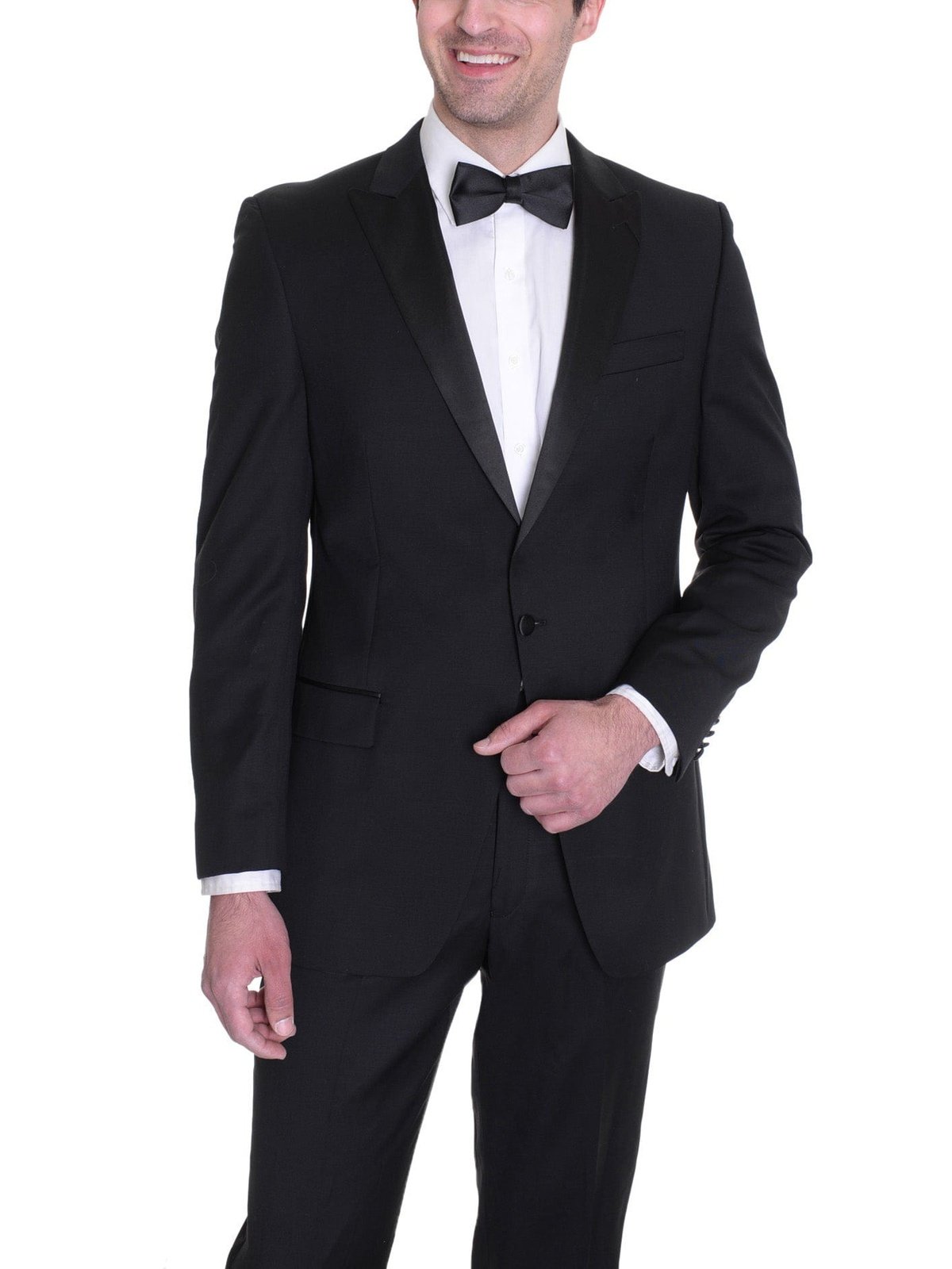 A finely tailored classic fit 100% wool tuxedo at a reasonable price? You found it. The Manzini black 100% Wool Classic Fit Tuxedo with peak lapels is made from luxury wool fabric that drapes superbly across the body. It is expertly designed and constructed for optimal fit. It’s the ideal tux for wedding parties and groomsmen, as well as for year-round formal wear.