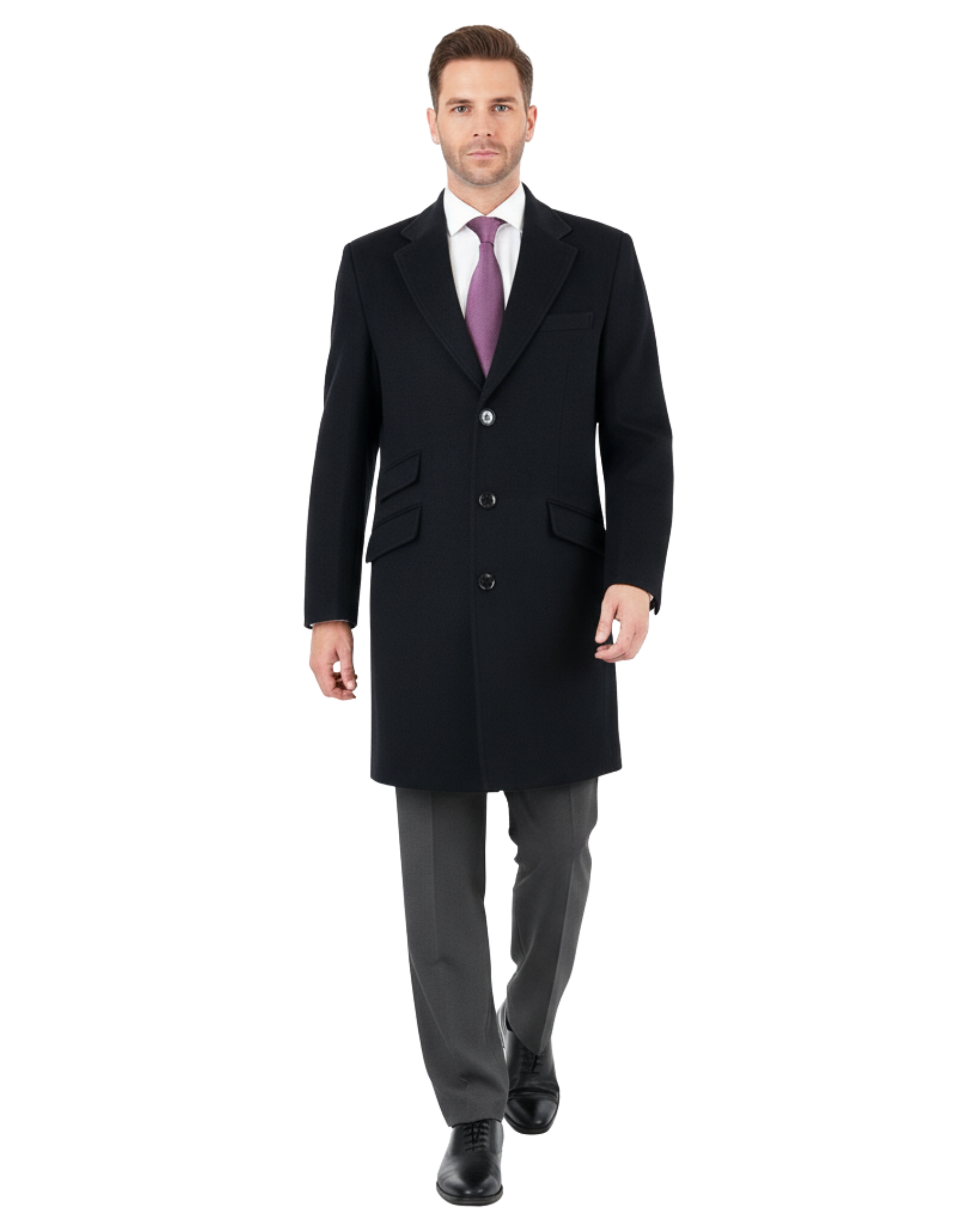 Men's Wool Cashmere Single Breasted Black 3/4 Length Car Coat Top Coat