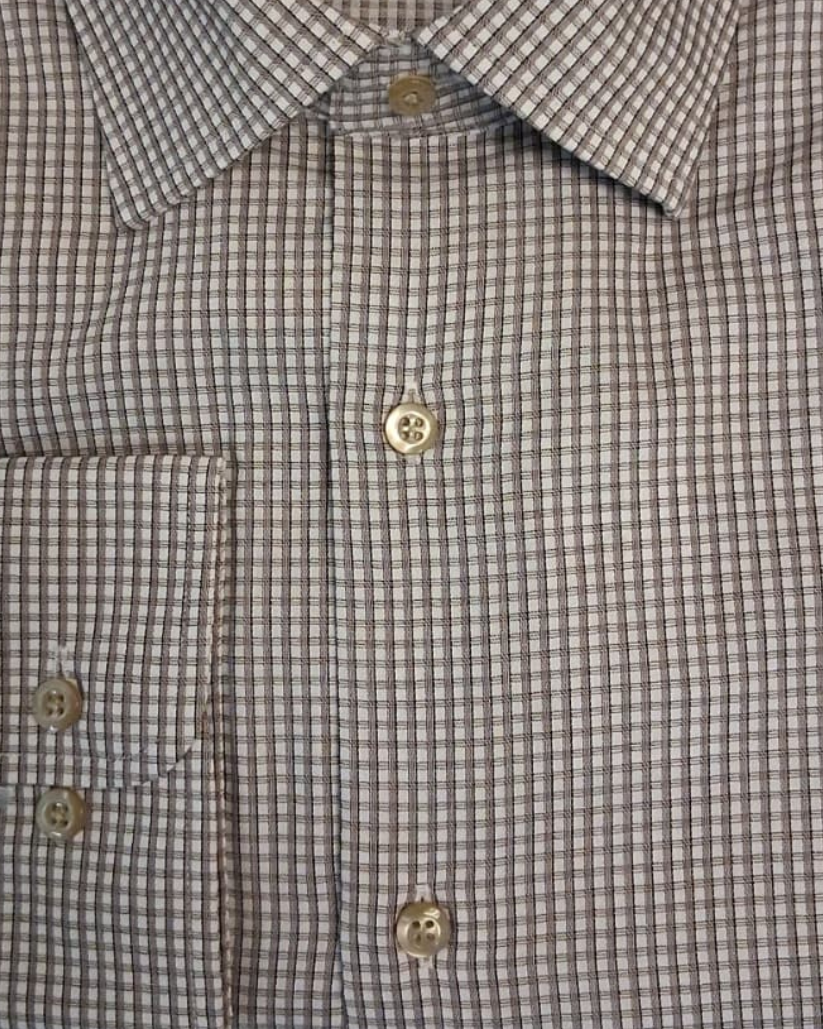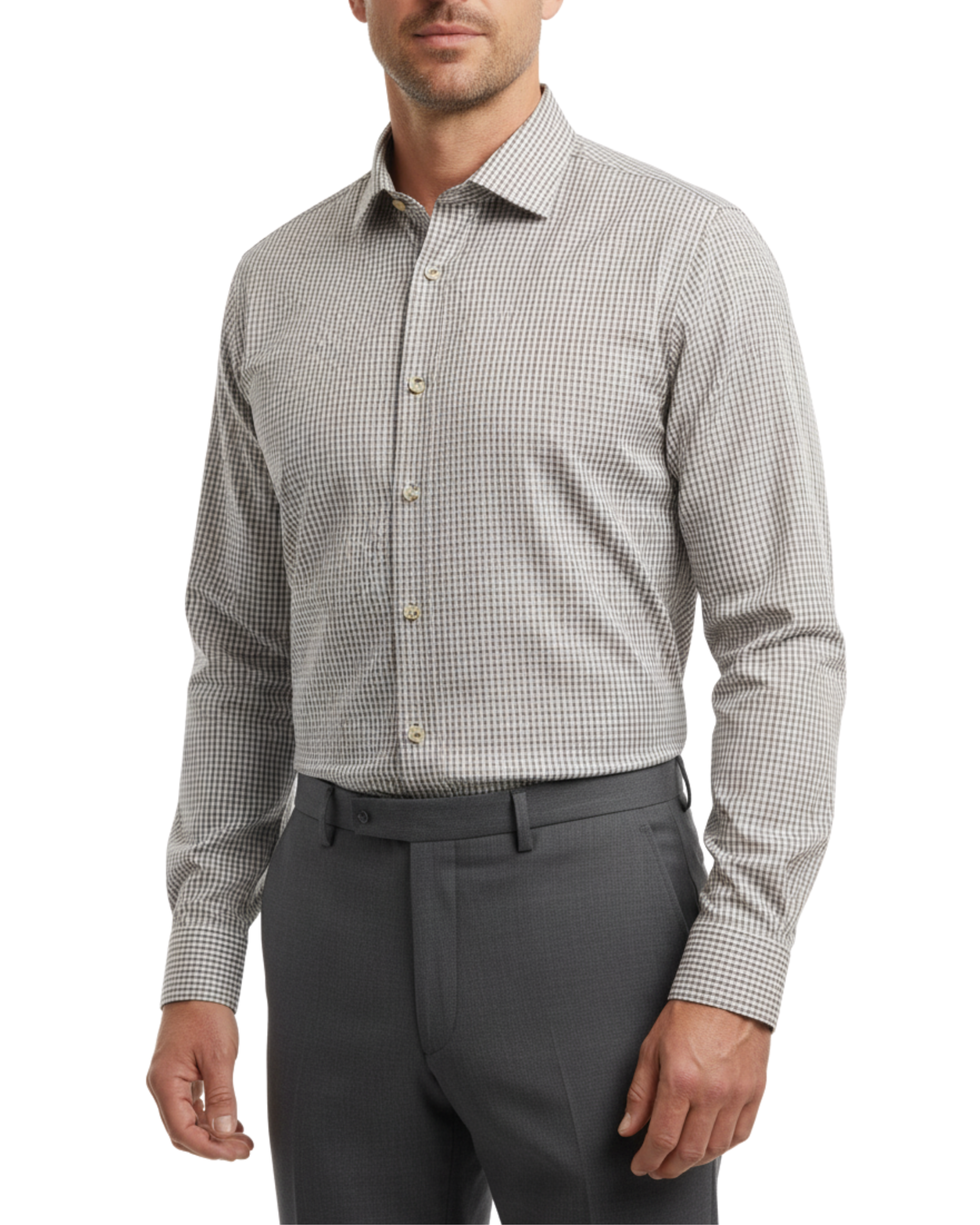 This brown and white dress shirt features a classic contemporary fit and textured micro-check fabric for a clean, sophisticated look. Designed with a spread collar and stretch material, it offers comfort and versatility for business or formal wear.