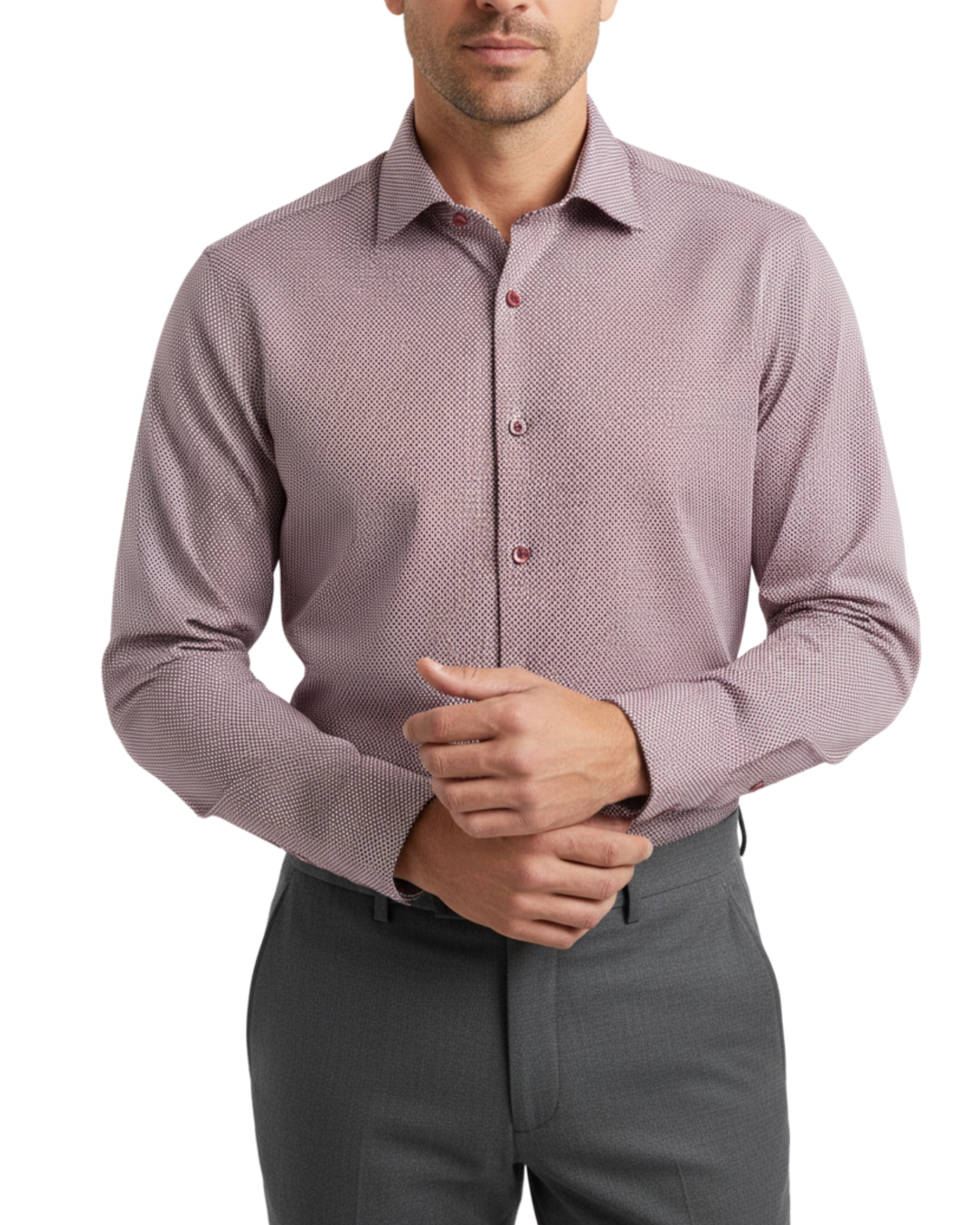 This burgundy dress shirt features a modern slim fit and textured micro-check fabric for a clean, sophisticated look. Designed with a spread collar and stretch material, it offers comfort and versatility for business or formal wear.