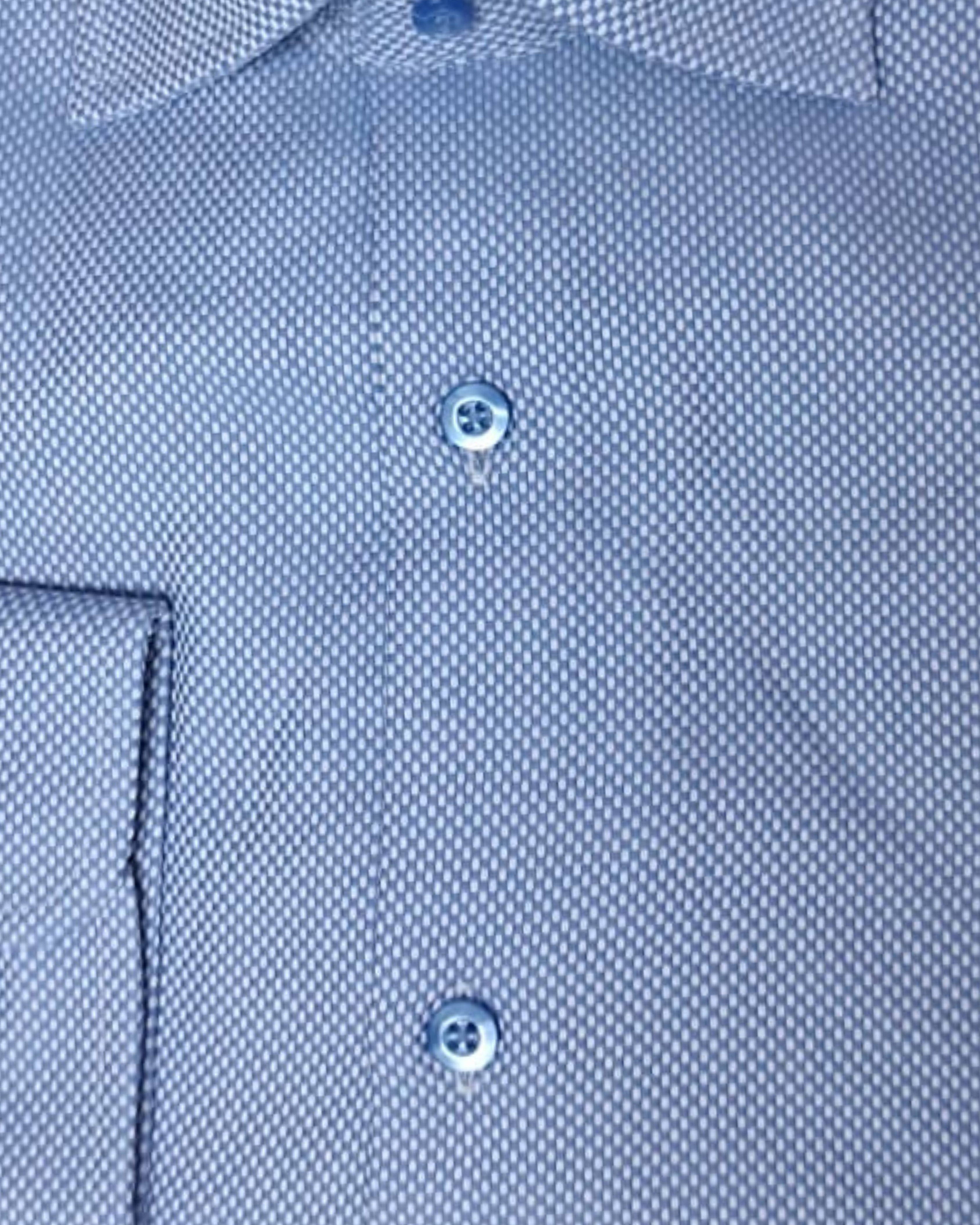 This cadet blue dress shirt features a modern slim fit and textured micro-check fabric for a clean, sophisticated look. Designed with a spread collar and stretch material, it offers comfort and versatility for business or formal wear.