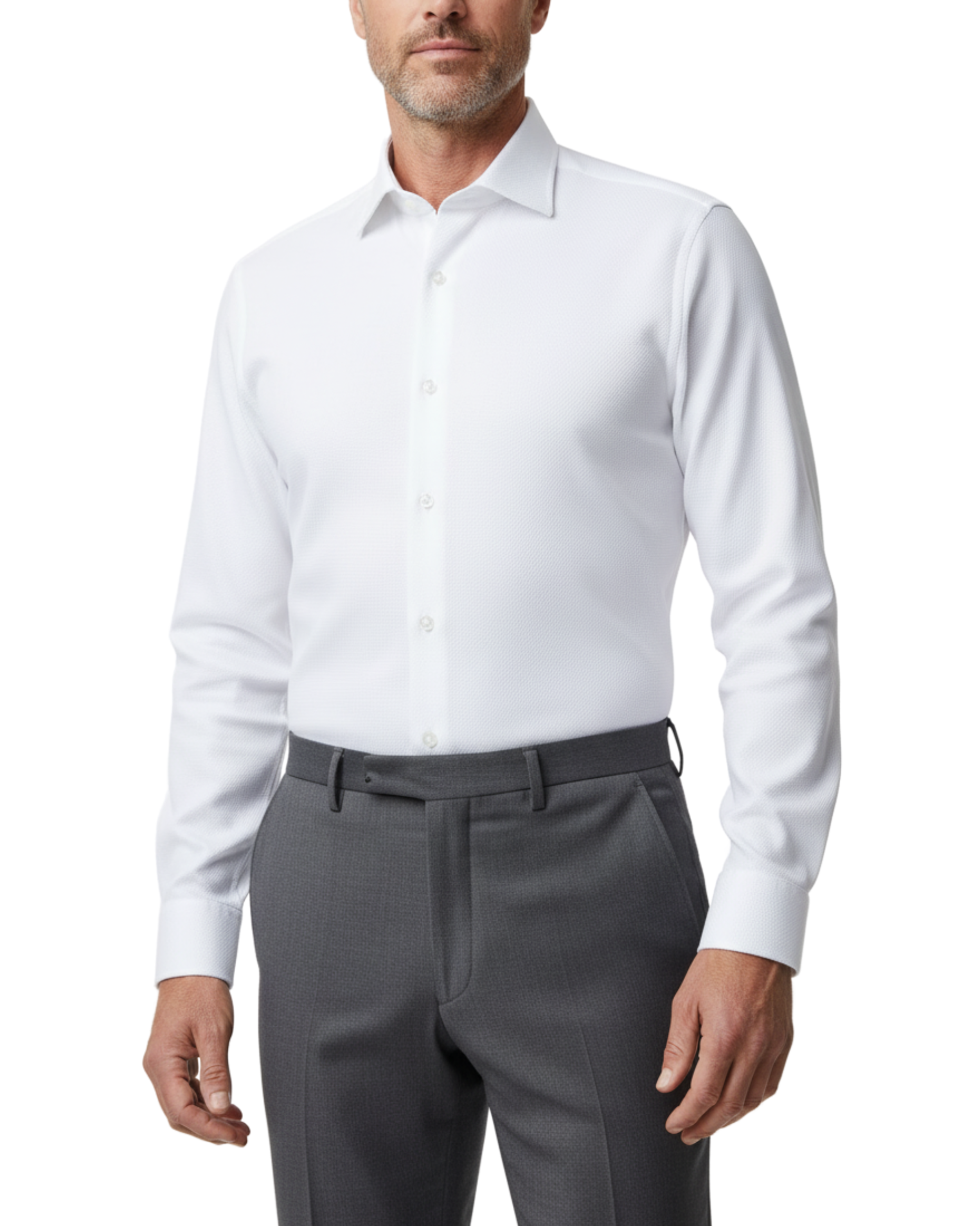 This white dress shirt features a modern slim fit and textured waffle weave fabric for a clean, sophisticated look. Designed with a spread collar and stretch material, it offers comfort and versatility for business or formal wear.
