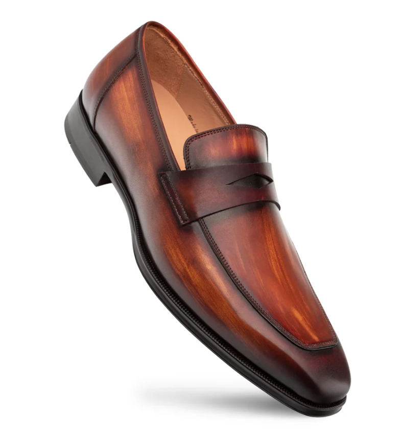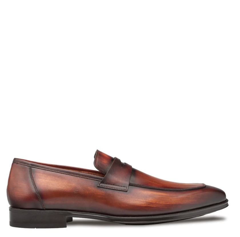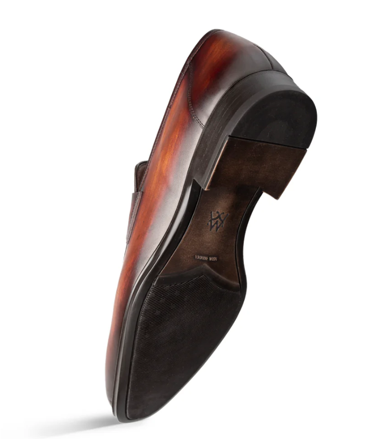 The Mezlan Avenue loafer is handcrafted in Spain from rich, hand-burnished cognac rust calfskin. Featuring a classic penny strap and sleek apron toe, it’s elegant yet versatile. A cushioned memory foam insole and rubber sole offer all-day comfort with a refined look.