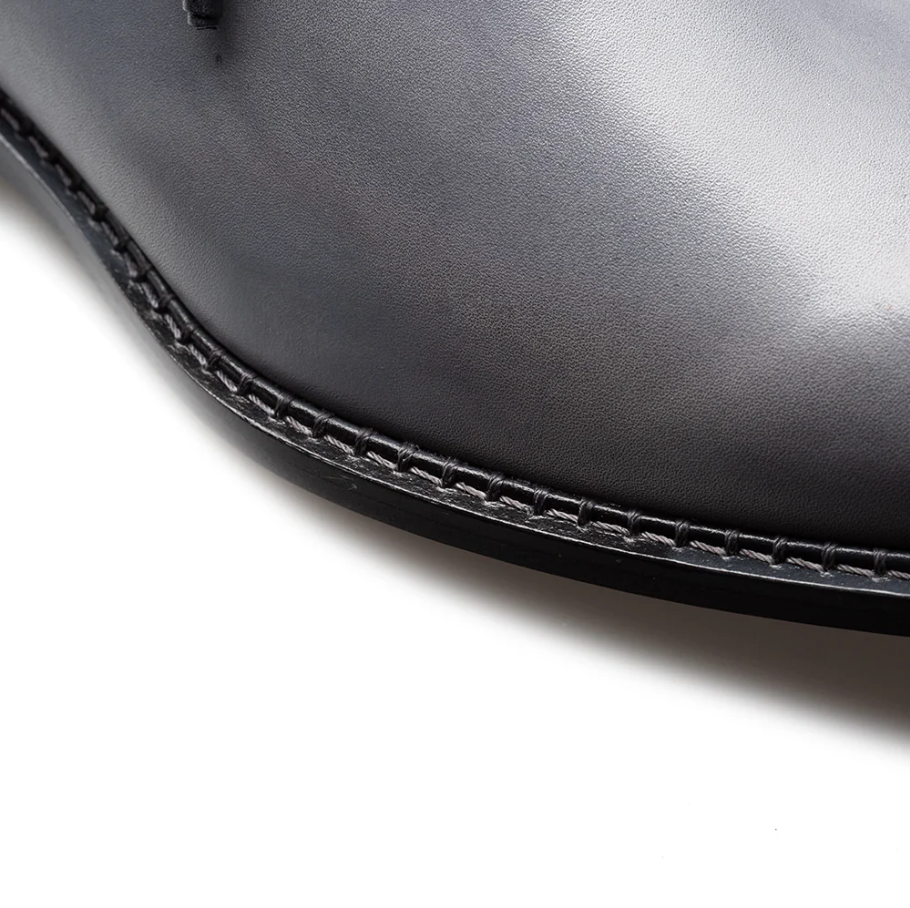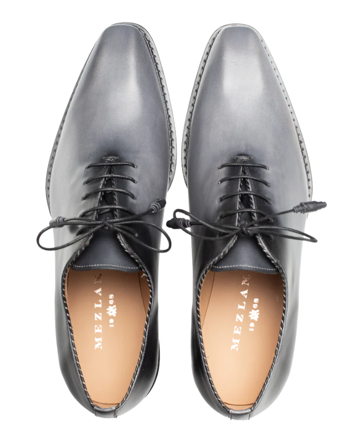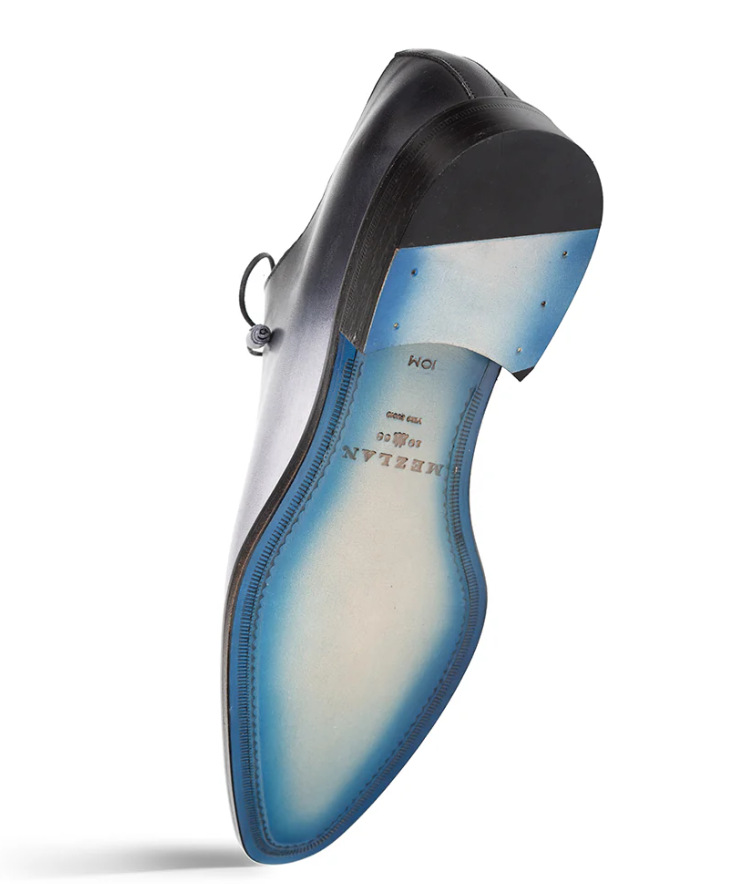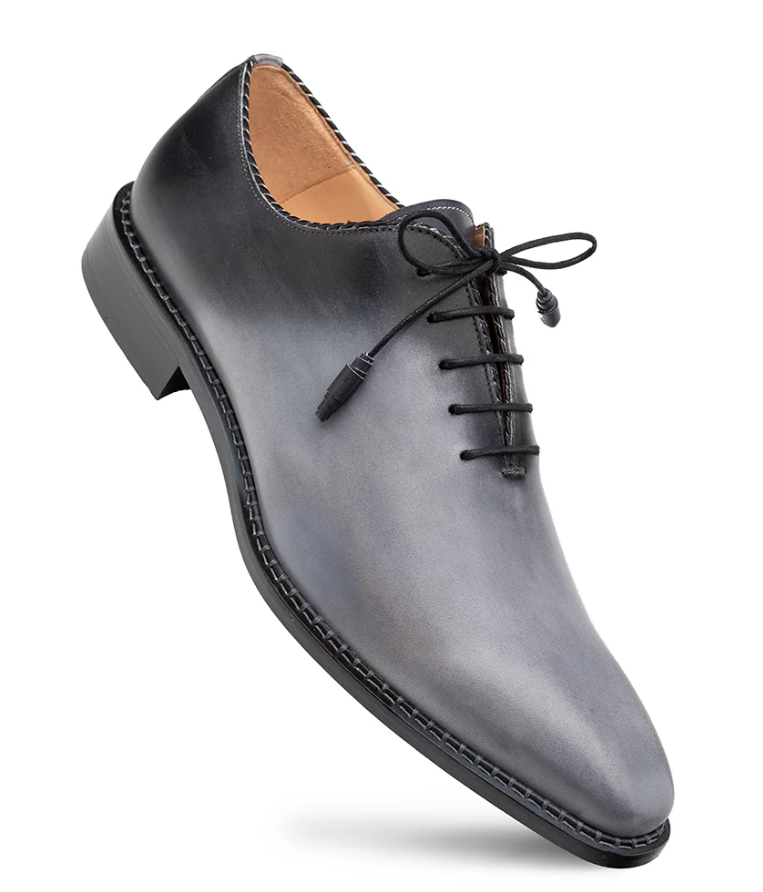 Elevate your formal footwear with the Mezlan Barbaro two-tone grey and black Oxford shoes. Crafted in Spain, they feature a smooth hand-stained patina leather upper with a subtle gradient design. A memory foam insole and leather sole ensure comfort and durability ideal for business, evening wear, or any formal occasion.