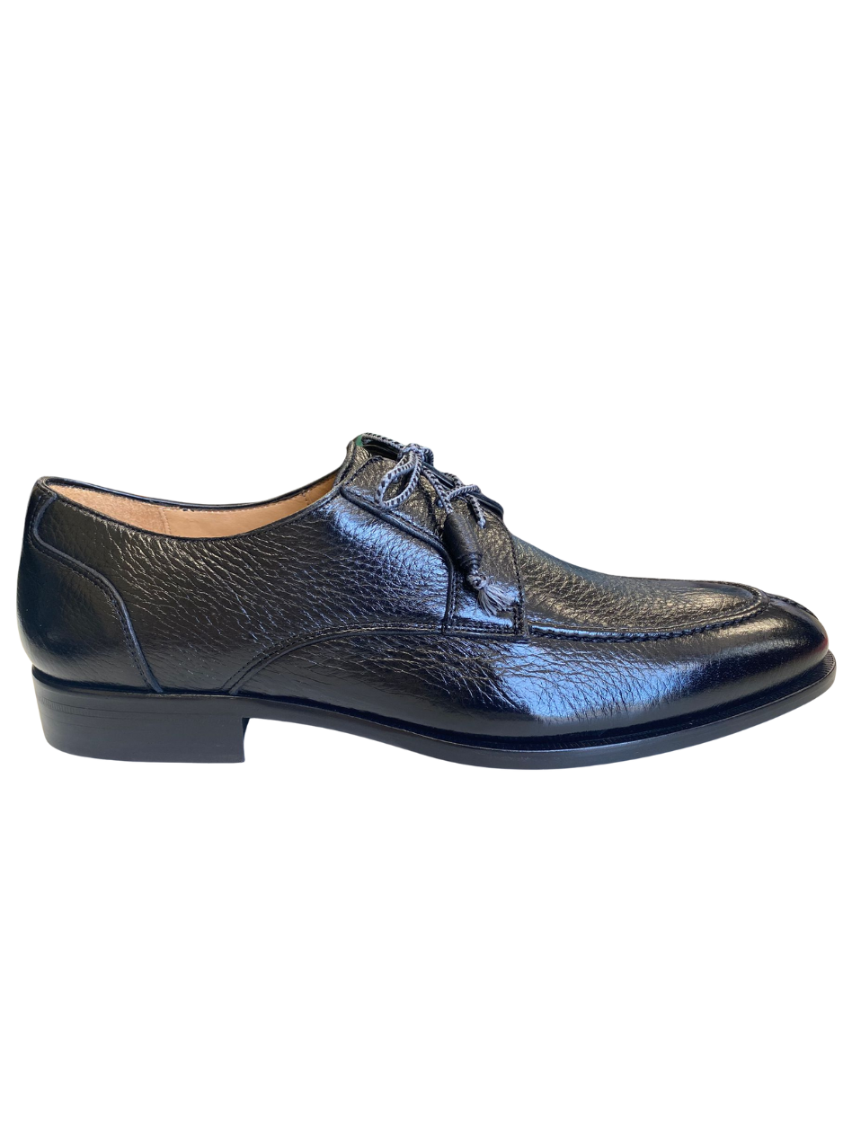 Elevate your formal footwear with the Mezlan Fratello black pebbled leather Derby shoes. Crafted in Spain, they feature a richly textured full-grain leather upper, apron toe detailing, and an open-lace design. A leather lining and sole ensure comfort and durability, making them ideal for business or formal occasions.