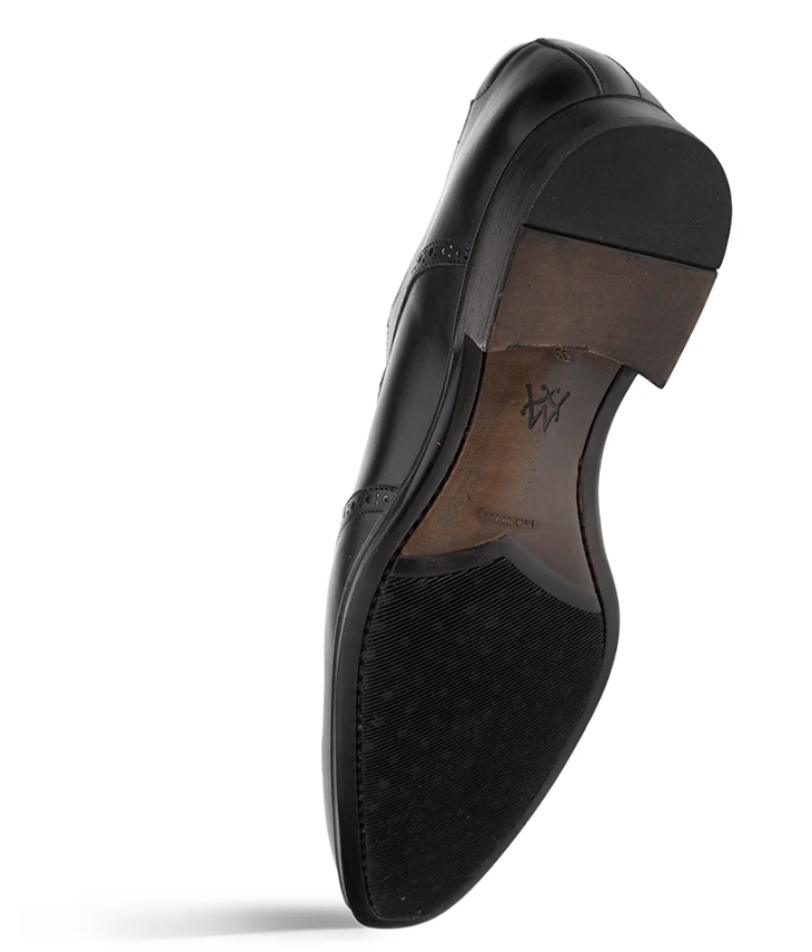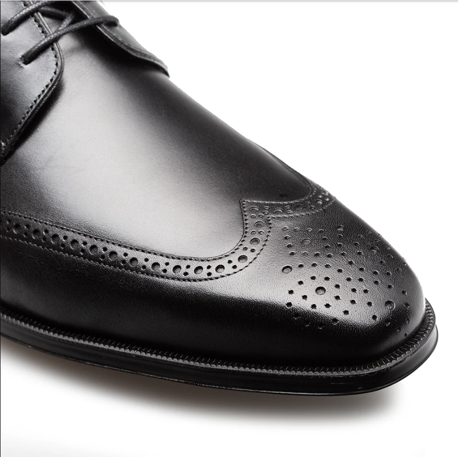 This elegant black wingtip derby is crafted from smooth, hand-stained patina leather with detailed brogue stitching for a refined finish. The open-lace design offers a classic look with added comfort. Built with an injected memory foam insole and a durable leather-look rubber sole, it delivers day-long support without sacrificing style. Handmade in Spain, this shoe is ideal for suits, dress trousers, or any formal outfit.