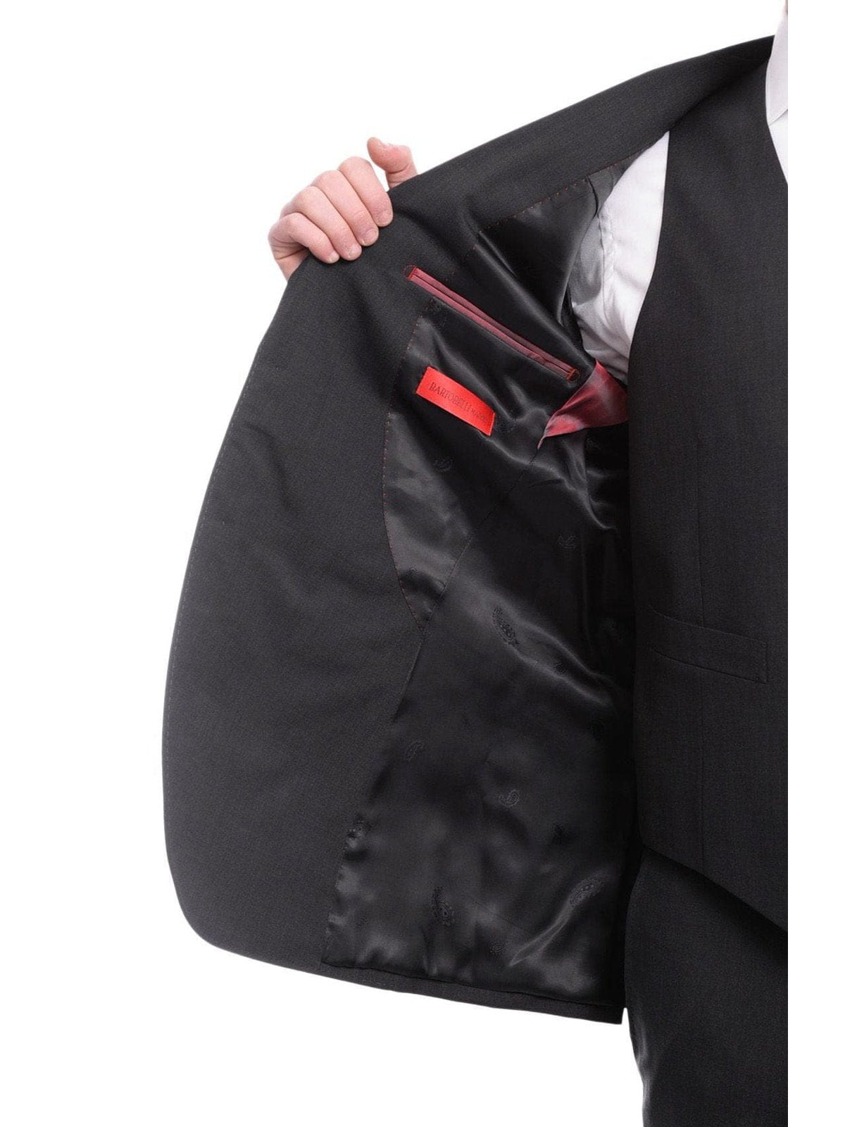 Luxury Italian Marzotto Wool for an affordable price? Finally! This Napoli Slim Fit charcoal Marzotto Wool suit has a luxury feel and excellent construction and tailoring. Its breathable 100% wool fabric drapes elegantly across the body. The slim fit is modern and sharp. It’s the perfect suit for wedding parties and groomsmen, as well as for year-round business wear.