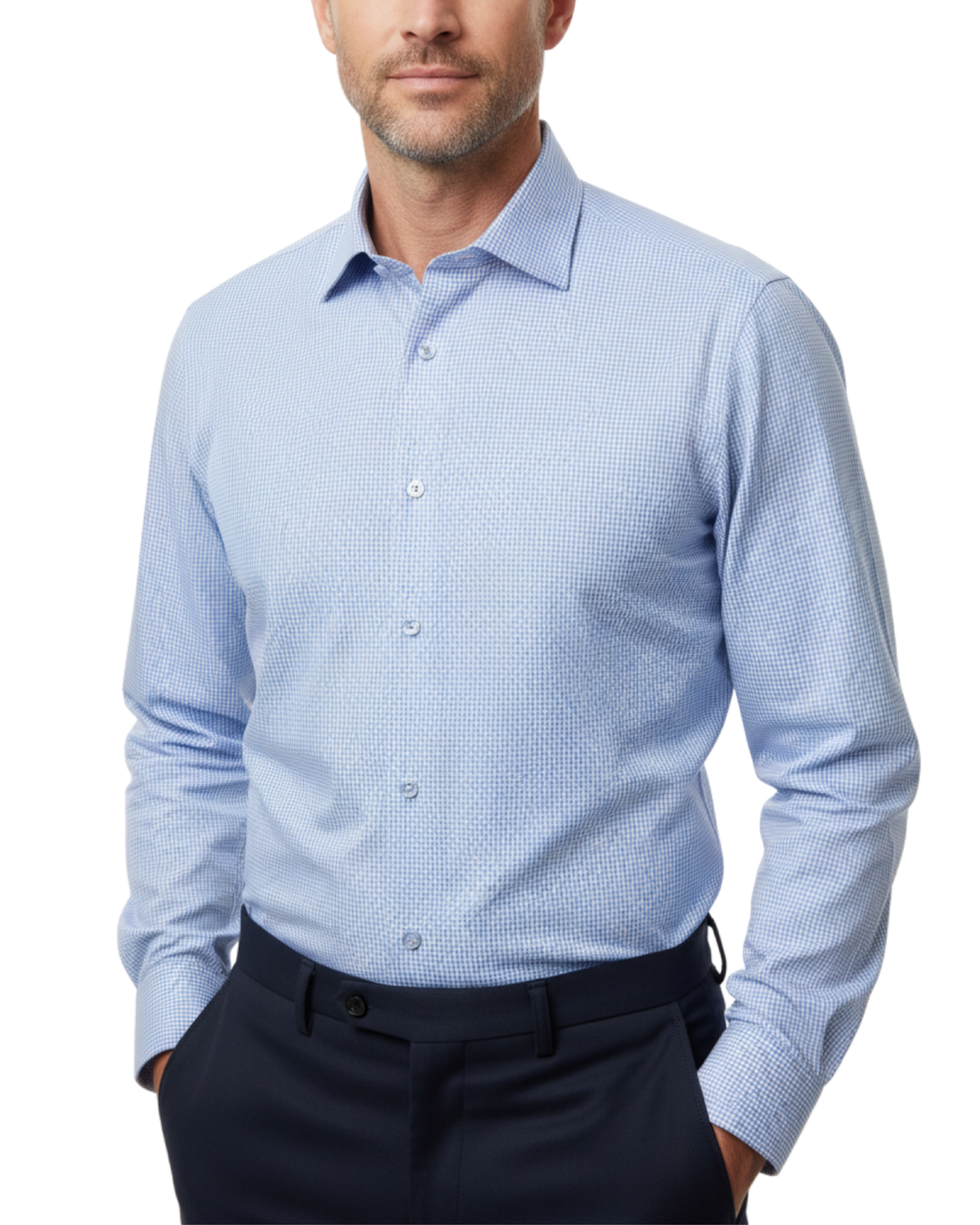 Proper Shirtings Cadet Blue Grid Windowpane Contemporary Fit Cotton Spread Collar Wrinkle Free Dress Shirt