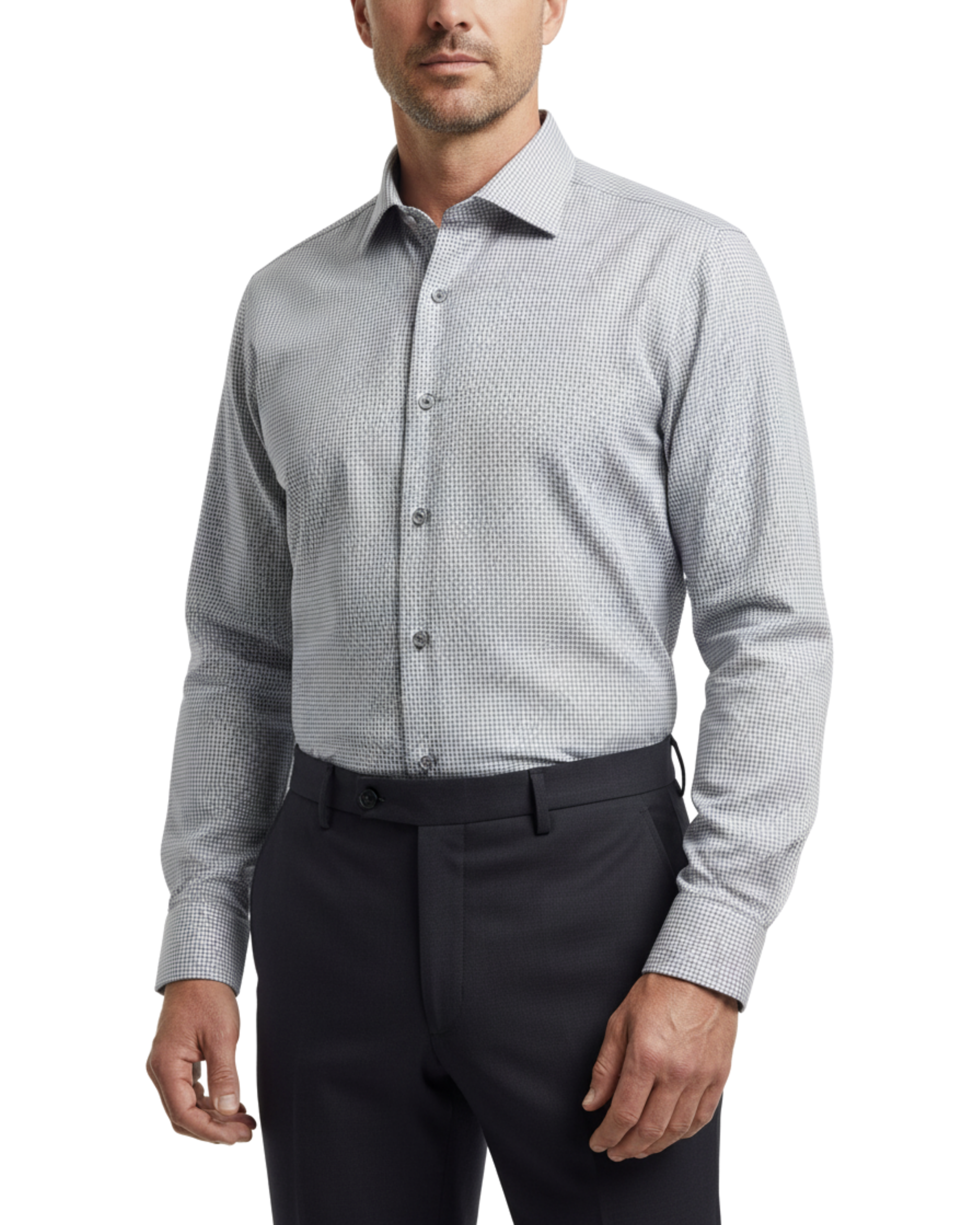 Proper Shirtings Gray Grid Windowpane Contemporary Fit Cotton Spread Collar Wrinkle Free Dress Shirt