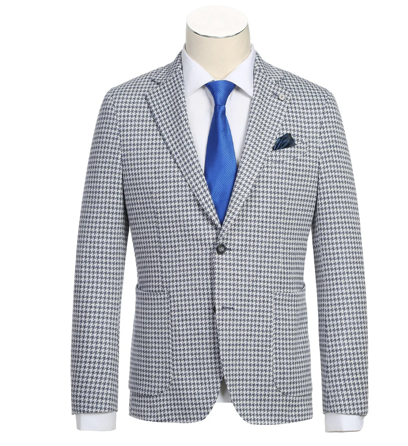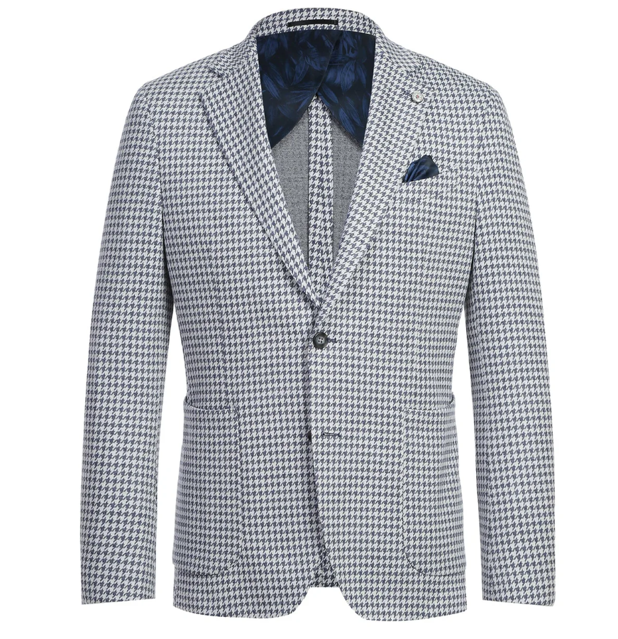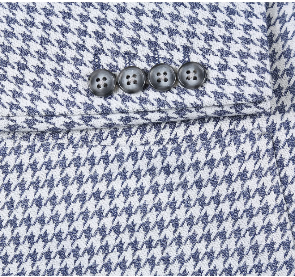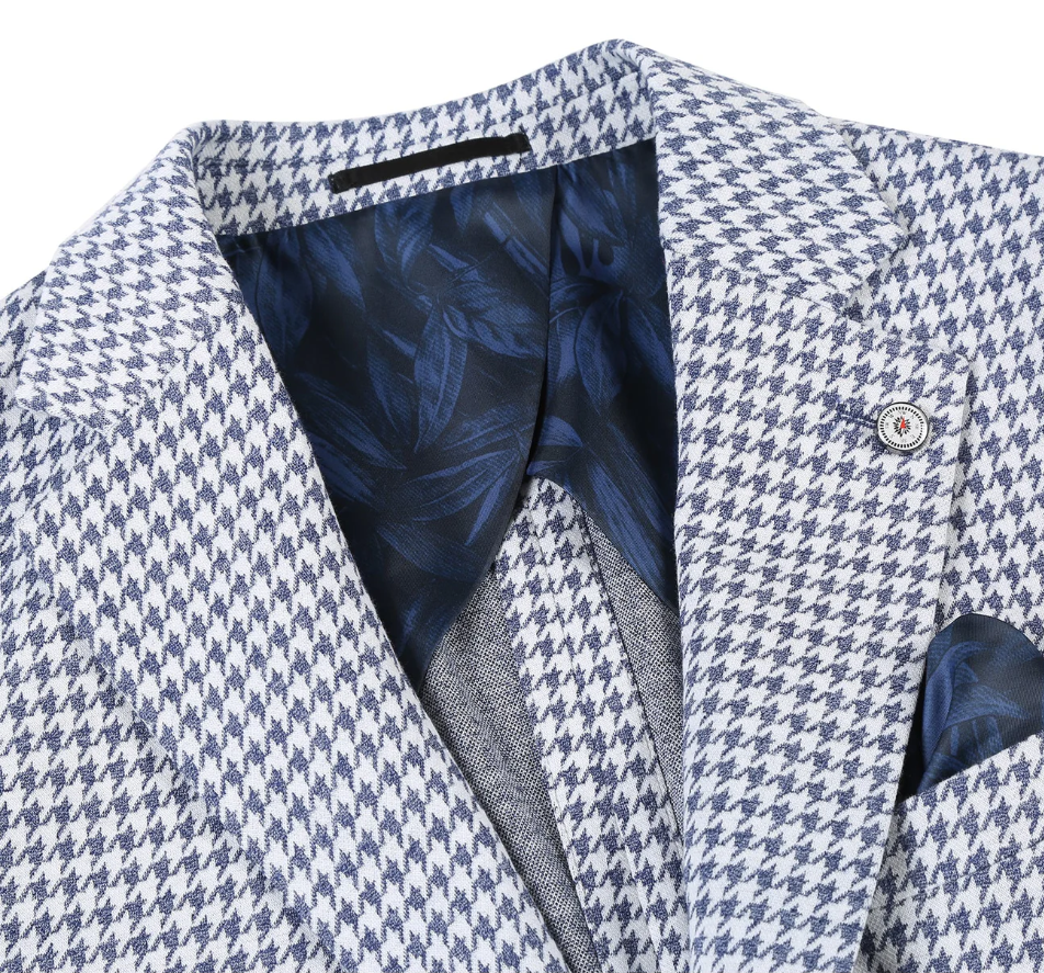Raphael Blue White Houndstooth Slim Fit Patch Pockets Notch Lapels Blazer