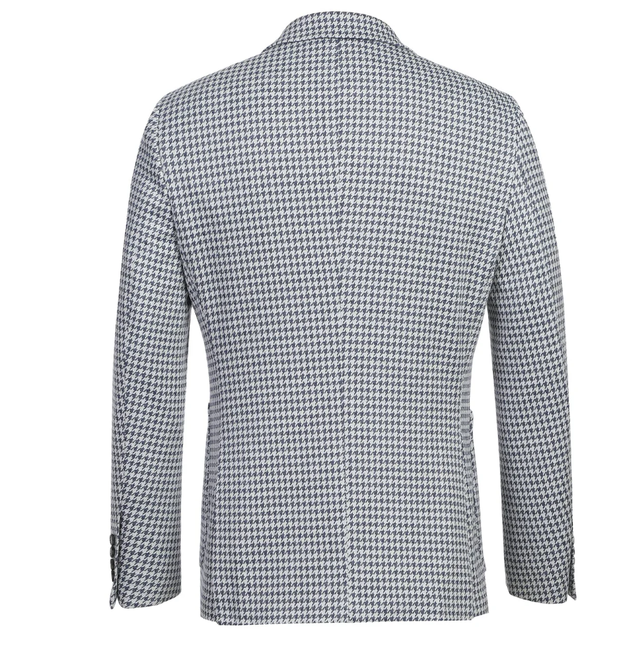 This blue and white houndstooth blazer blends a crisp, eye-catching pattern with refined tailoring. Made from lightweight fabric, it offers comfort without sacrificing structure. The two-button front, notch lapels, and patch pockets create a polished yet versatile style that pairs effortlessly with dress trousers or chinos for both professional and social settings.
