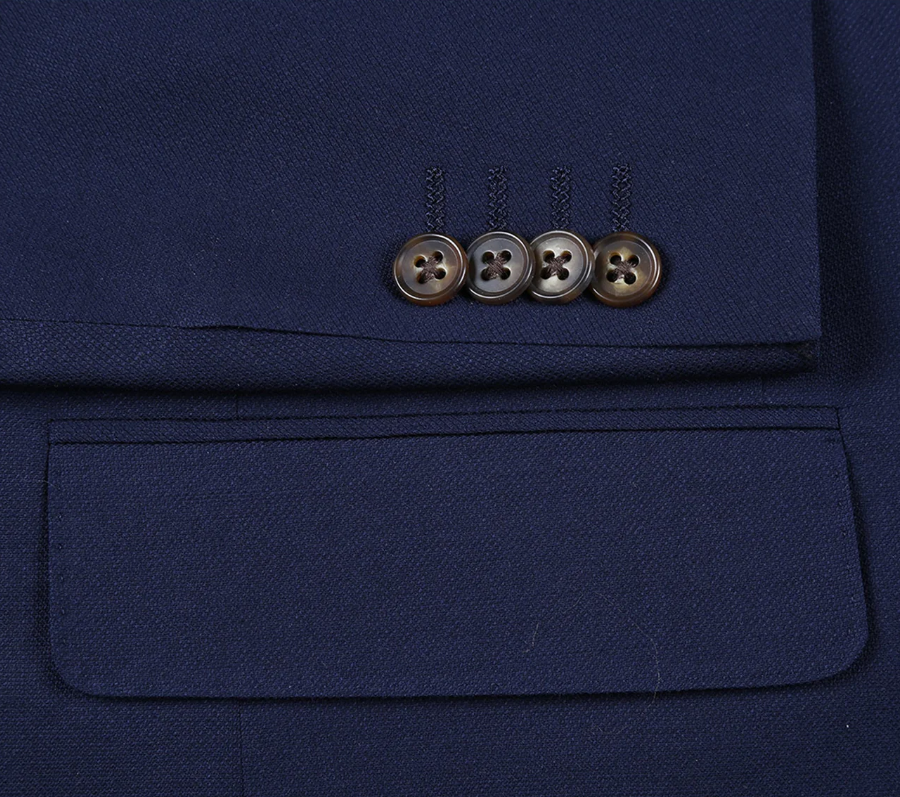 This navy blazer is a wardrobe essential that works for the office, weddings, or a night out. Designed with a classic two-button front and notch lapels, it keeps the look sharp without being over the top. The rich purple patterned lining and matching pocket square add a refined detail that sets it apart. Pair it with dress trousers for a polished suit look or wear it with chinos or dark denim when you want something more relaxed but still put-together.