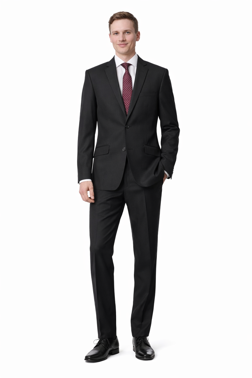 A finely tailored slim fit wool-touch suit at a reasonable price? You found it. The Raphael Slim Fit Black Two Button Suit is made from synthetic fabric that drapes superbly across the body. It is expertly designed and constructed for optimal fit. It’s the ideal suit for wedding parties and groomsmen, as well as for year-round business wear.