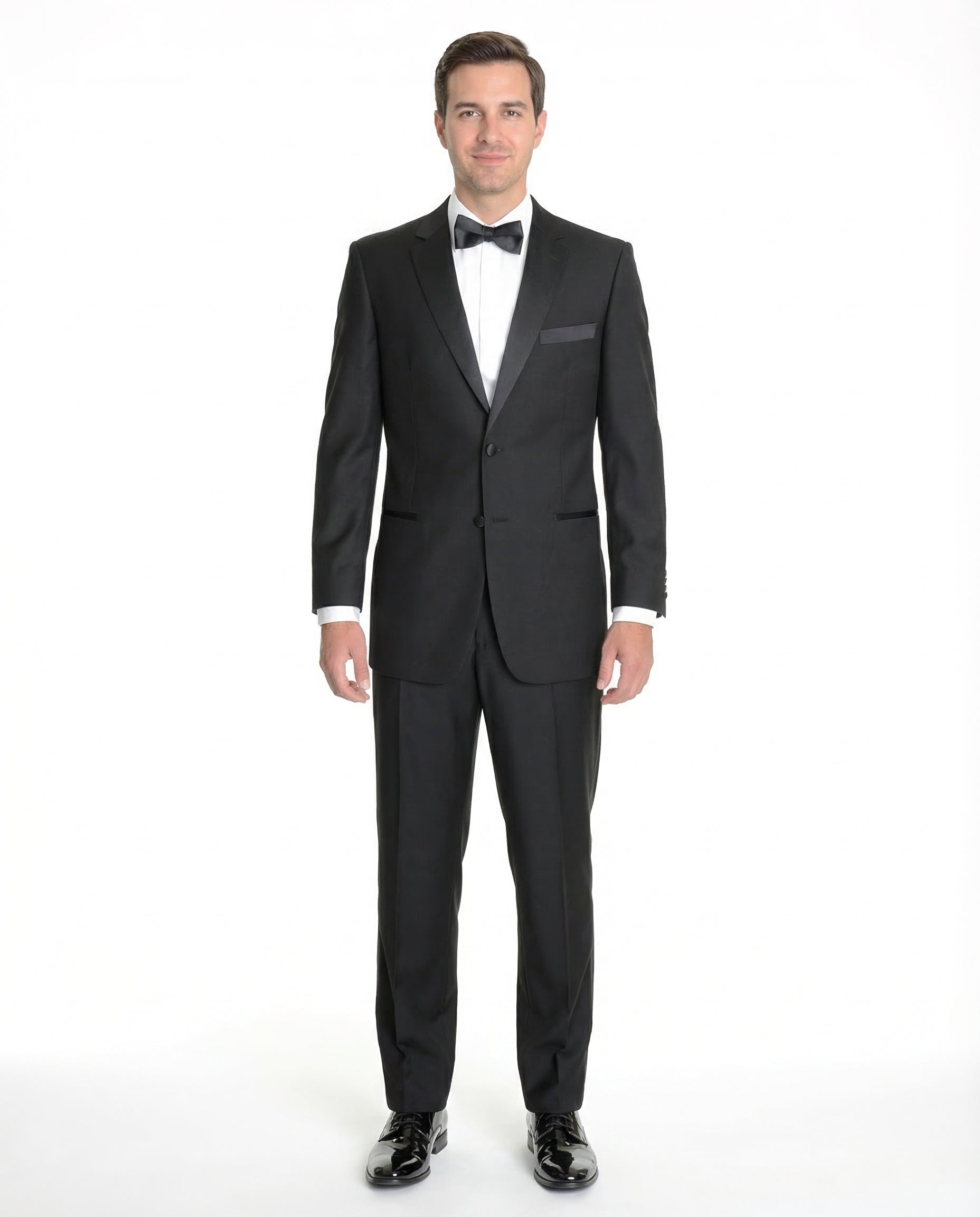 Here is proof that an affordable tux can be perfectly tailored. Wear this sophisticated black classic fit tuxedo for formal social events. This classic fit tux is constructed from premium synthetic fibers. The tailoring is impeccable. The seams are extra durable. This tux is ideal for wedding parties, groomsmen, and prom.