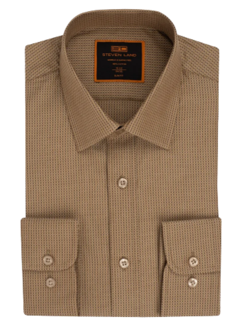 Steven Land Textured Golden Brown Slim Fit Spread Collar Wrinkle Shrink Free Cotton Dress Shirt