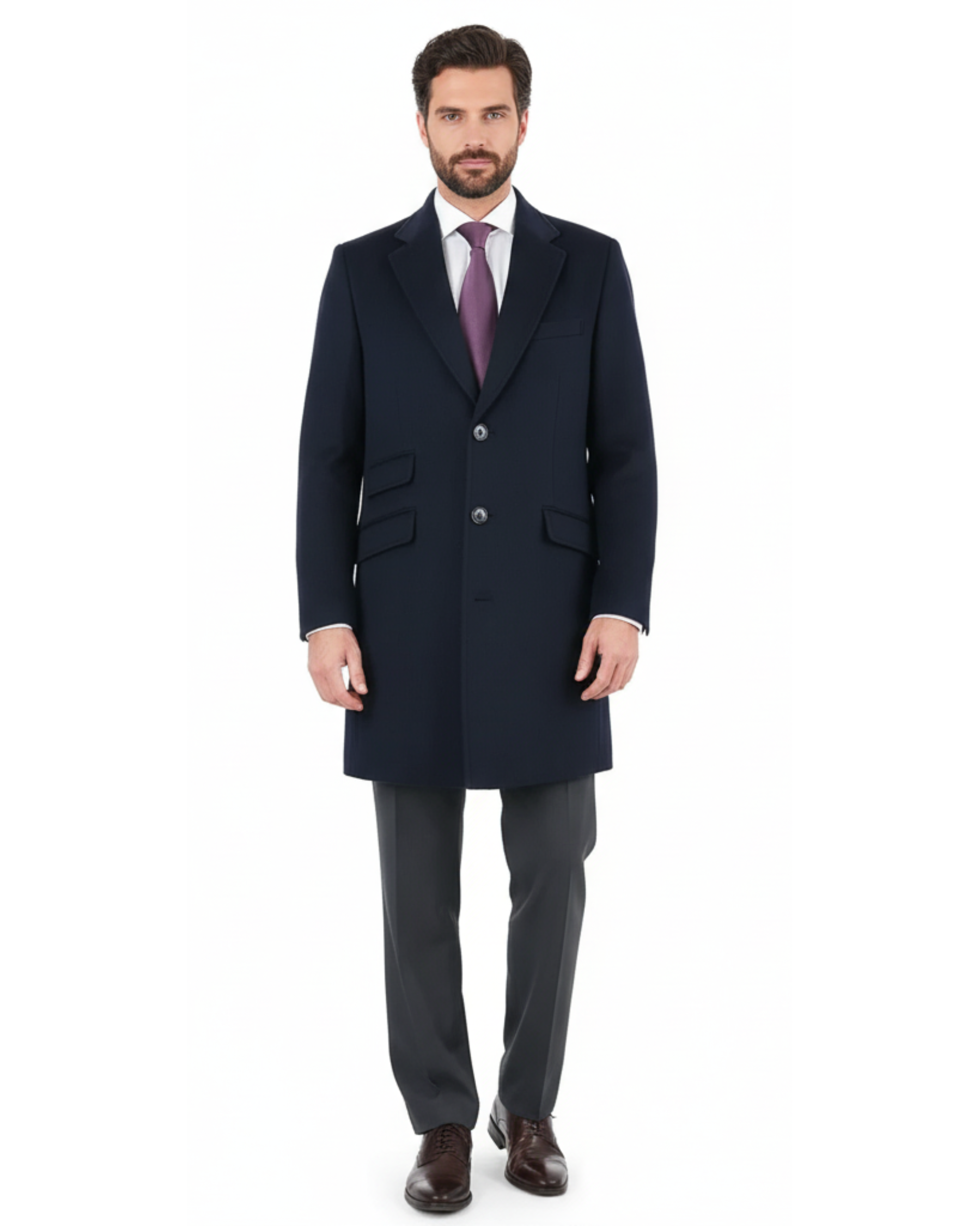 Men's Wool Cashmere Single Breasted Blue 3/4 Length Car Coat Top Coat