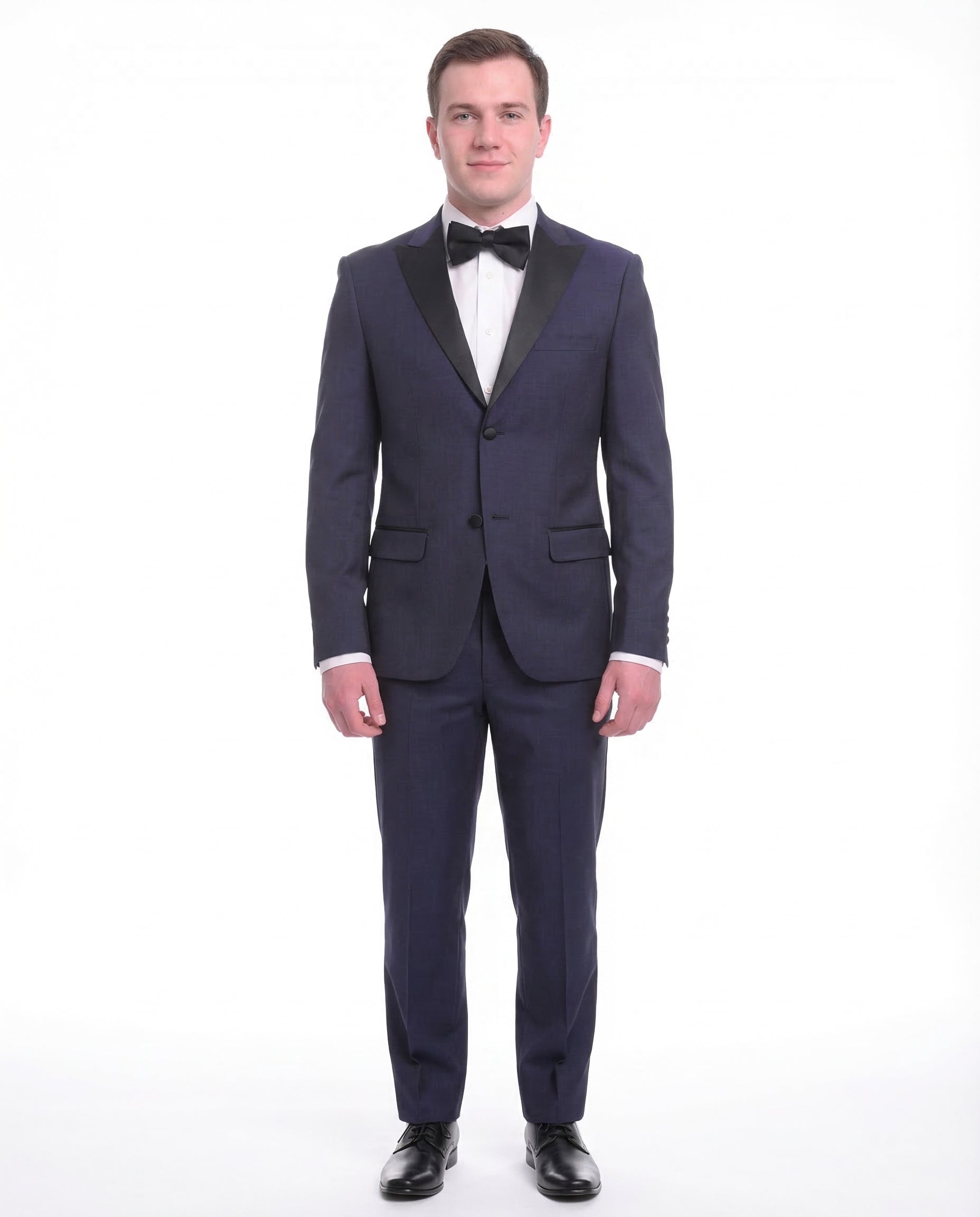 Unique Slim Fit Midnight Blue Subtle Sheen Wool Tuxedo Suit Satin Peak Lapels